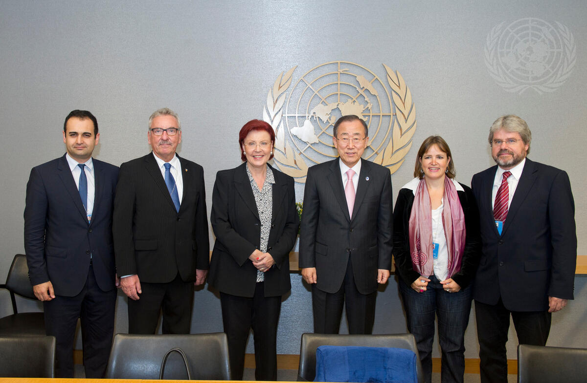 Secretary-General Ban Ki-moon (third from right) meets with Heike Haensel (second from right), Chair of the German Bundestag Subcommittee on the United Nations, and the Committee’s Members (from left): Bijan Djir-Saraj; Jürgen Klimke; Heide Wieczorek Zeul; and Thilo Hoppe.