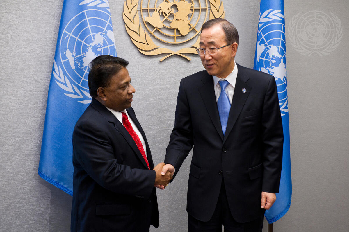 Secretary-General Ban Ki-moon (right) meets with Dullas Alahapperuma, Minister for Youth Affairs of the Democratic Socialist Republic of Sri Lanka.