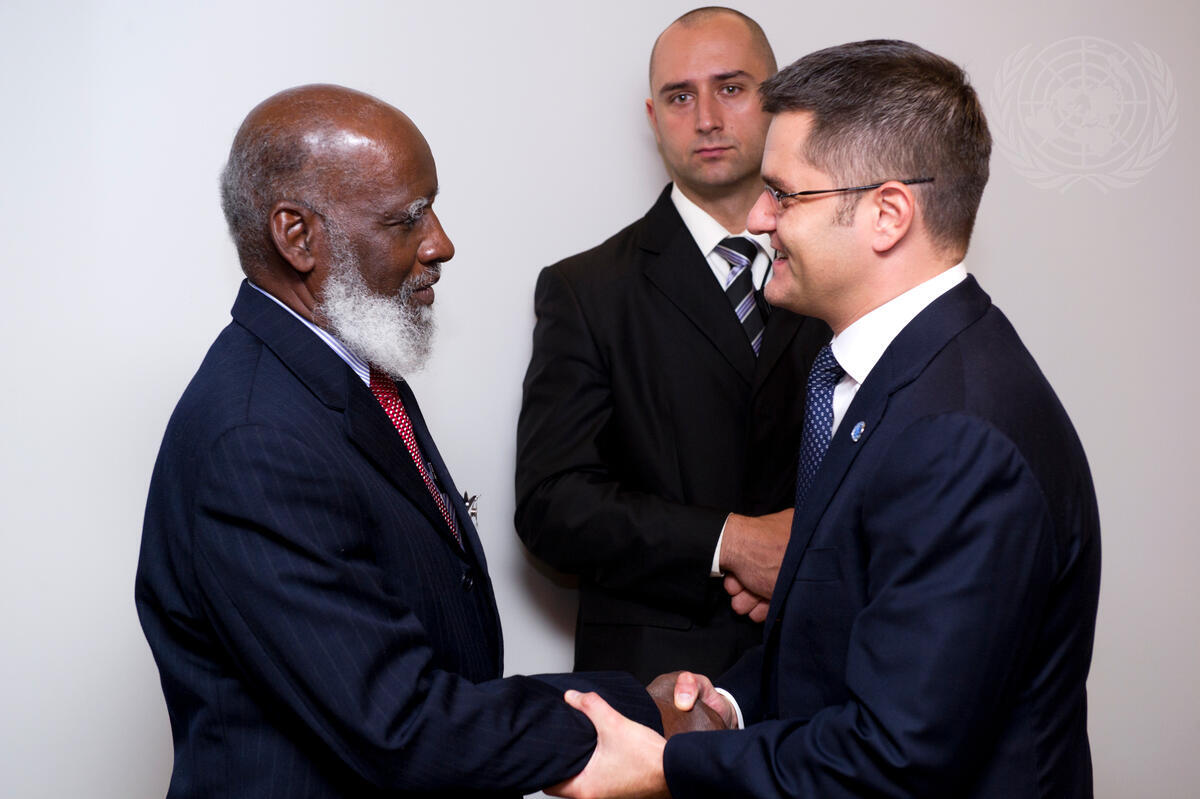 Vuk Jeremic (right), President of the sixty-seventh session of the General Assembly, meets with Wilfred Elrington, Attorney General, Minister for Foreign Affairs and Foreign Trade of Belize.
