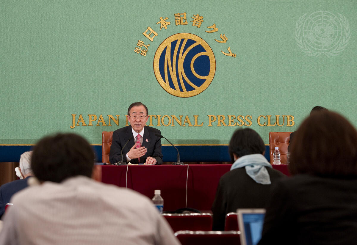 Secretary-General Ban Ki-moon addresses a press conference at the Japan National Press Club in Tokyo, following the high-level international conference on the future of Afghanistan, hosted by Japanese Prime Minister Yoshihiko Noda.