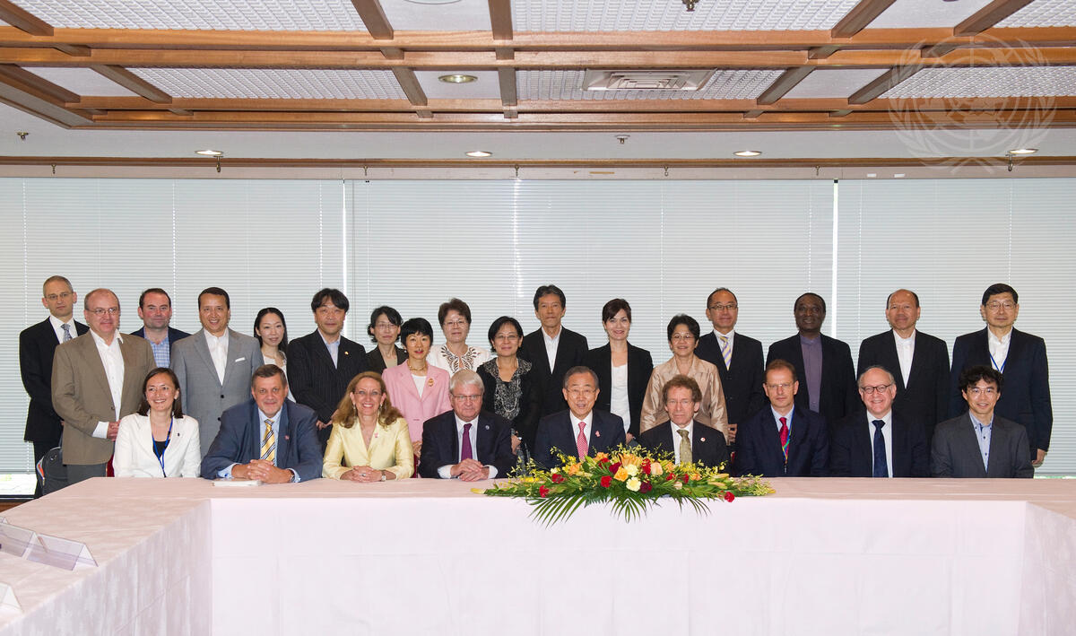 Secretary-General Ban Ki-moon (front, centre), accompanied by Hervé Ladsous (left of Mr. Ban), Under-Secretary-General for Peacekeeping Operations, meets with the heads of UN agencies in Tokyo, Japan.
