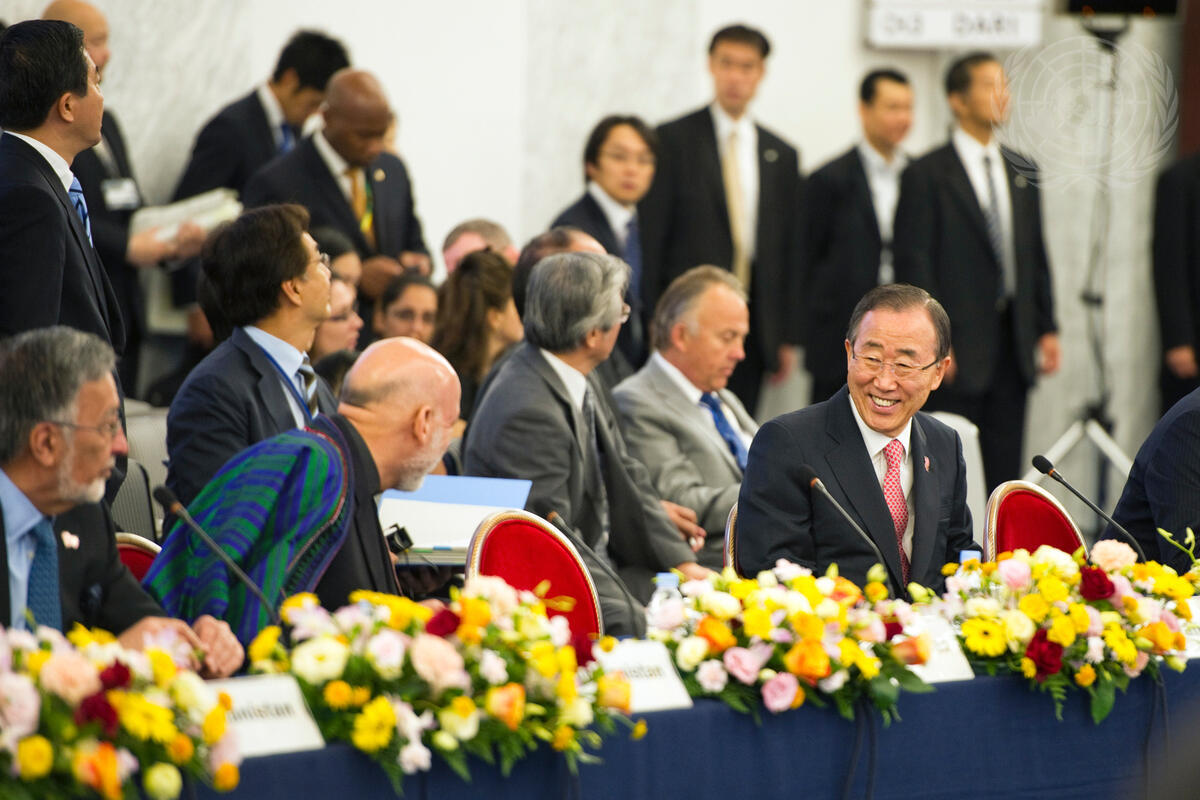 Secretary-General Ban Ki-moon (right) shares a laugh with Afghan President Hâmid Karzai (second from left) during the high-level Tokyo Conference on Afghanistan, in Tokyo, Japan.