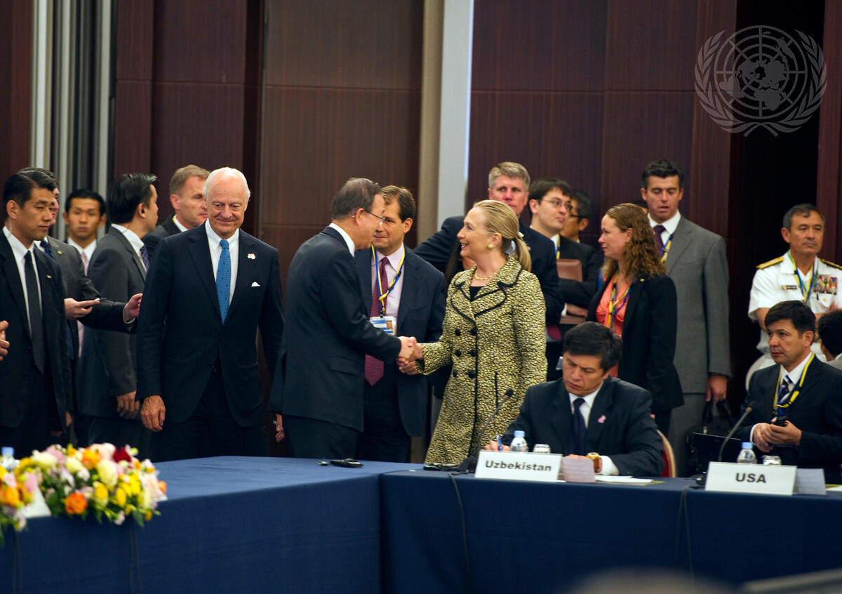 Secretary-General Ban Ki-moon (centre left) greets Hillary Rodham Clinton, United States Secretary of State, at the high-level international conference on the future of Afghanistan, held in Tokyo, Japan.