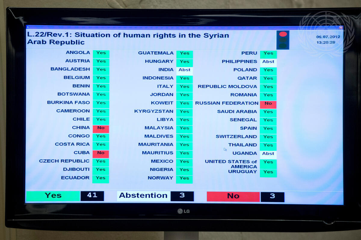 Screen showing tally of votes as the Council adopts a resolution condemning the widespread, systematic and gross violations of human rights in Syria.