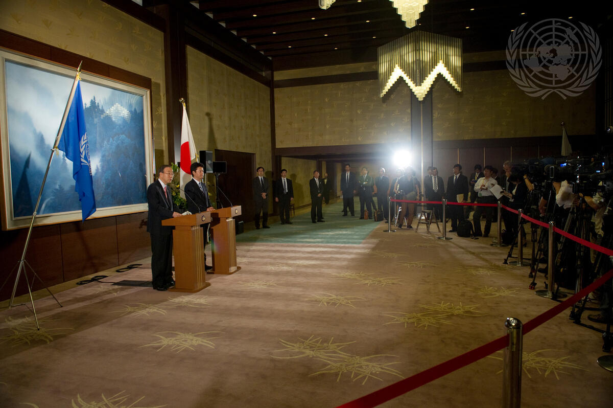 Secretary-General Ban Ki-moon (at left lectern) and Koichiro Gemba (next to Mr. Ban), Minister for Foreign Affairs of Japan, brief the press following their meeting in Tokyo.