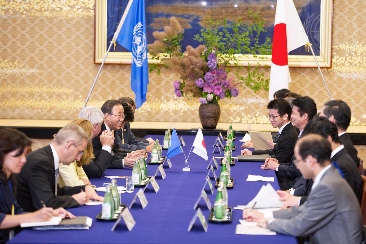 Secretary-General Ban Ki-moon (left) and Koichiro Gemba (across from Mr. Ban), Minister for Foreign Affairs of Japan, accompanied by their respective delegations, meet in Tokyo, Japan.