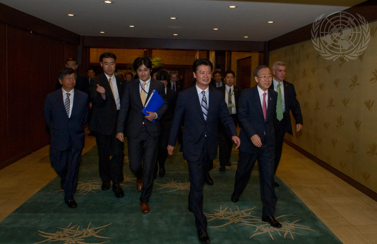 Secretary-General Ban Ki-moon (front, right) and Koichiro Gemba (left of Mr. Ban), Minister for Foreign Affairs of Japan, are shown en route to their meeting.