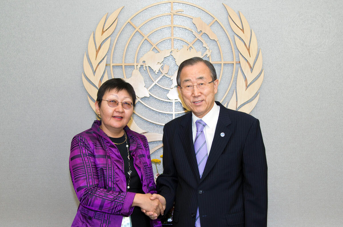 Enkhtsetseg Ochir (left), Permanent Representative of Mongolia to the United Nations, pays a farewell call on Secretary-General Ban Ki-moon.