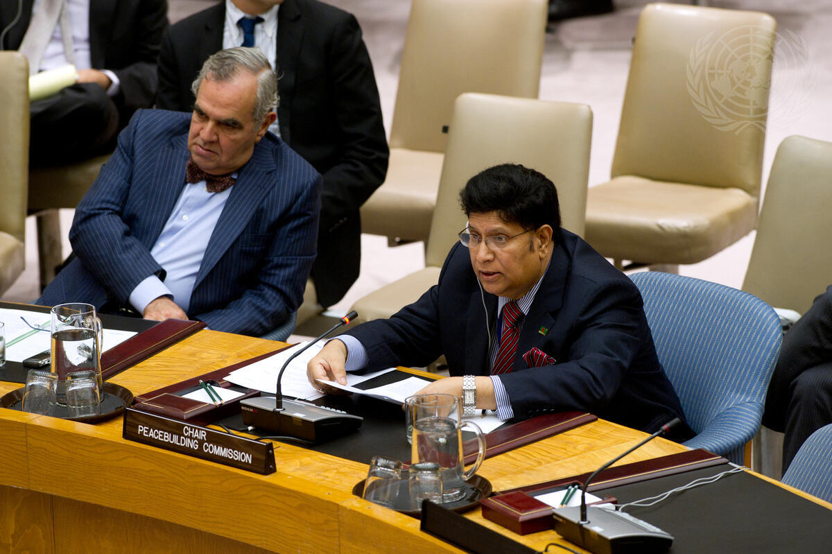 Abulkalam Abdul Momen (right), Permanenet Representativ of Bangladesh to the UN and Chair of the Peacebuilding Commission, addresses the Security Council at its debate on peacebuilding in post-conflict situations. At left is Jose Filipe Moraes Cabral, Permanent Representative of Portugal to the UN.