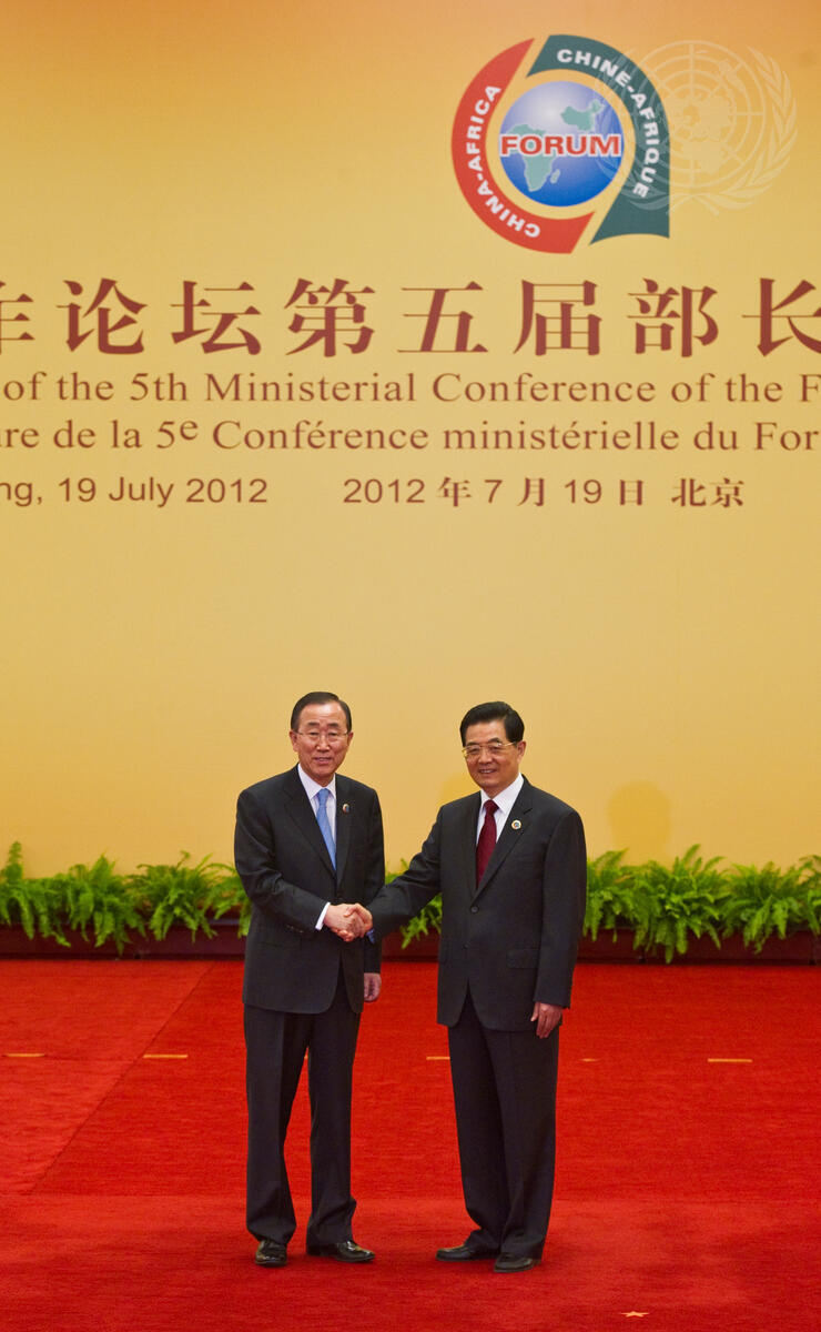 Secretary-General Ban Ki-moon (left) meets with Hu Jintao, President of the People’s Republic of China, at the 5th Ministerial Conference of the Forum on China-Africa Cooperation.