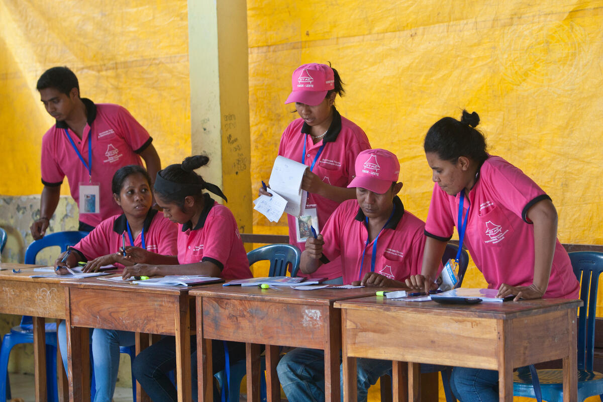 Polling officers tally votes after ballots were cast in Timor-Leste's parliamentary elections.