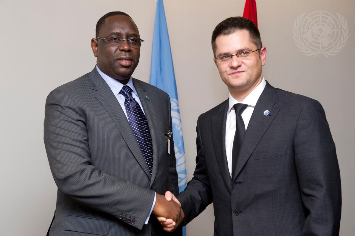 Vuk Jeremic (right), President of the sixty-seventh session of the General Assembly, meets with Macky Sall, President of the Republic of Senegal, President of Senegal.