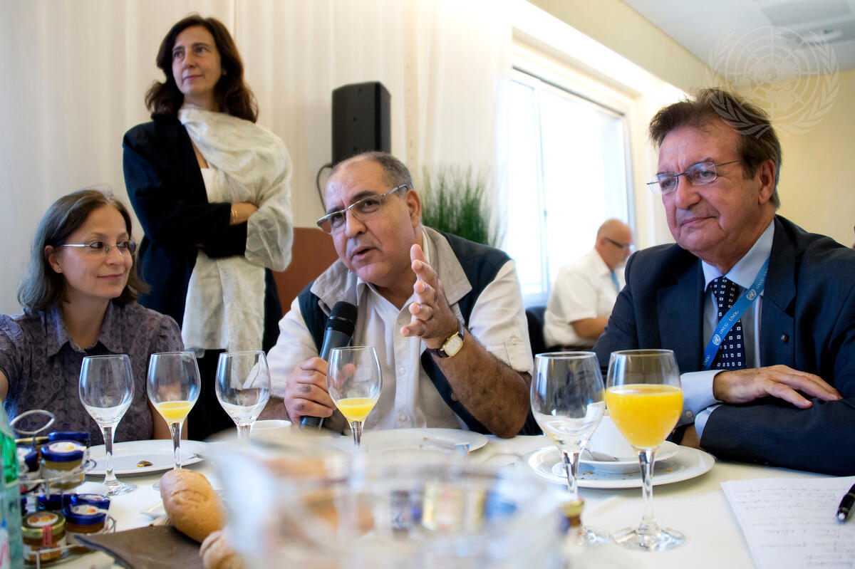 Mohamed Cherif (seated centre), journalist for SwissInfo, asks a question during the UN Information Service’s regular press briefing in Geneva.