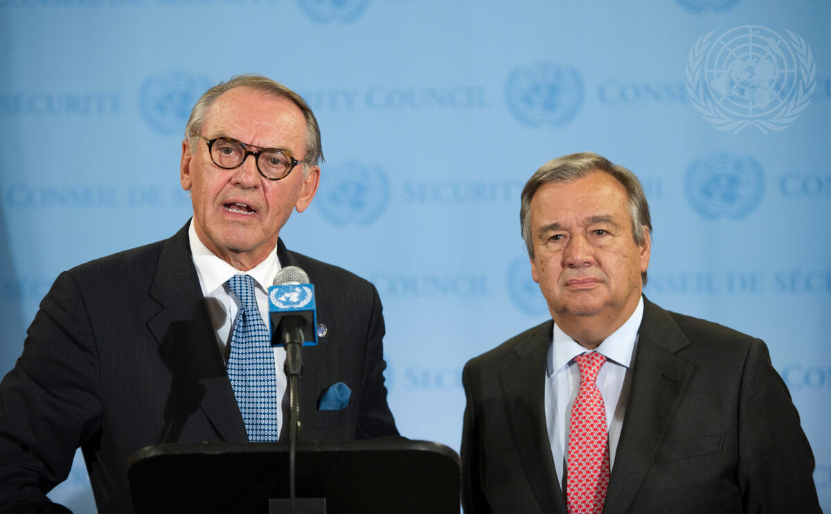 Deputy Secretary-General Jan Eliasson (left) and António Guterres, UN High Commissioner for Refugees, speak to the press following the Security Council's ministerial meeting on the humanitarian situation in Syria.