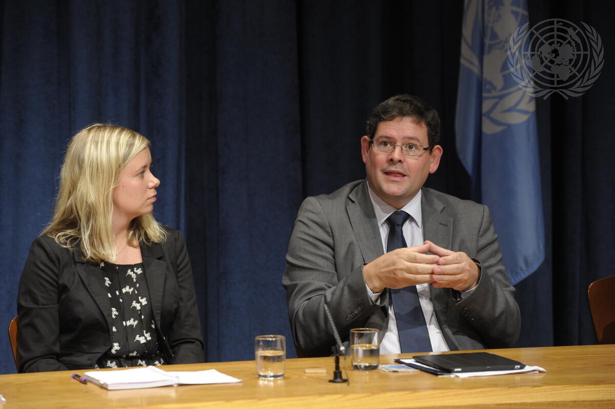 Ádám Kósa (right), Member of the European Parliament and the European People's Party and Chair of the informal session on women and disabilities, addresses a press briefing on the Fifth Session of the Conference of States Parties to the Convention on the Rights of Persons with Disabilities (CRPD). Also participating in the briefing, Jenny Nilsson (left), Youth Section President of the World Federation of the Deaf and Swedish delegate to the Conference of States Parties to the CRPD.
