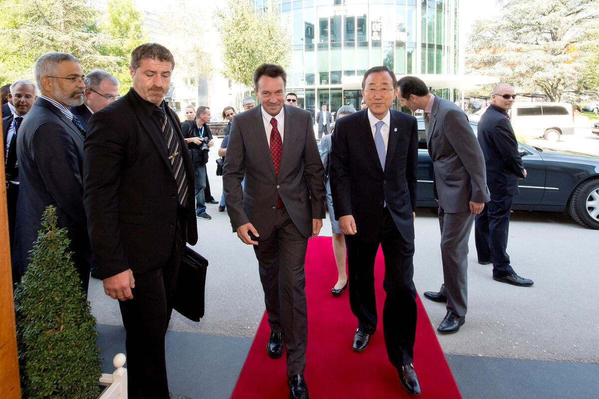 Secretary-General Ban Ki-moon (centre right) is welcomed by Peter Maurer (centre left), President of the International Committee of the Red Cross (ICRC), as he arrives at the ICRC’s offices in Geneva, Switzerland.