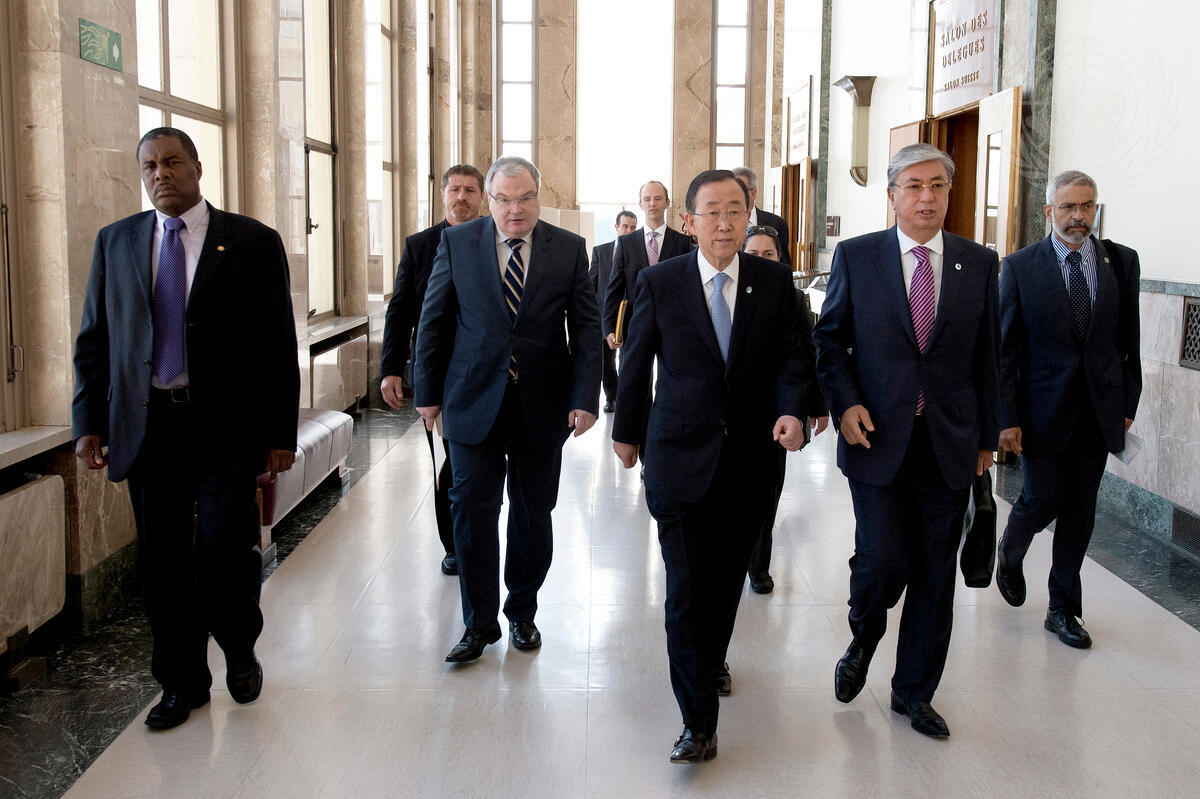 Secretary-General Ban Ki-moon (centre, in blue tie) meets with Kassym-Jomart Tokayev (right of Mr. Ban), Director-General of the UN Office at Geneva (UNOG), during his official visit to Geneva.
