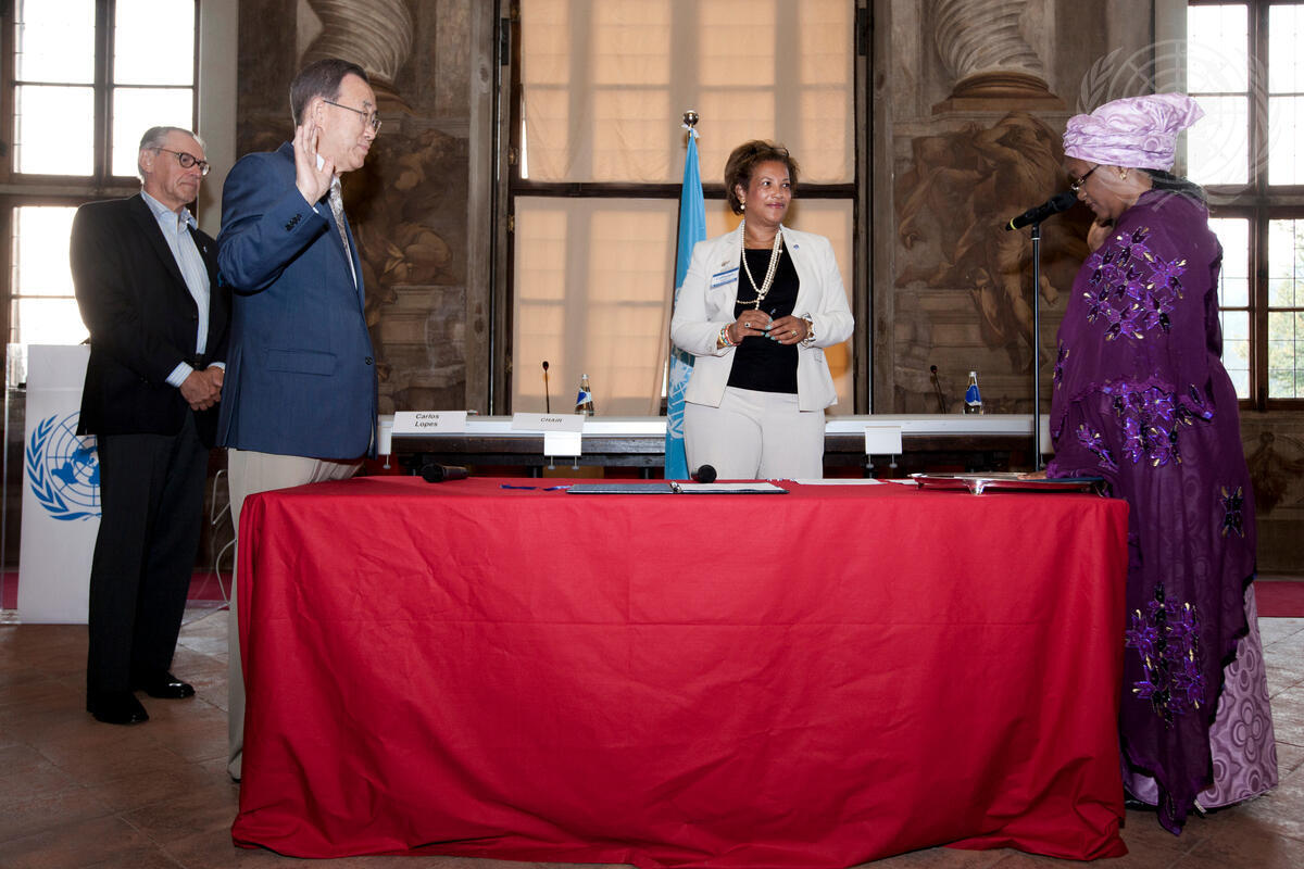 Secretary-General Ban Ki-moon (second from left) administers the oath of office to Zainab Hawa Bangura (right), his Special Representative on Sexual Violence in Conflict, during the two-day retreat for senior officials of the UN system, held in Turin, Italy. Also shown at swearing in: Deputy Secretary-General Jan Eliasson (left) and Catherine Pollard (centre), Assistant Secretary-General for Human Resources Management.