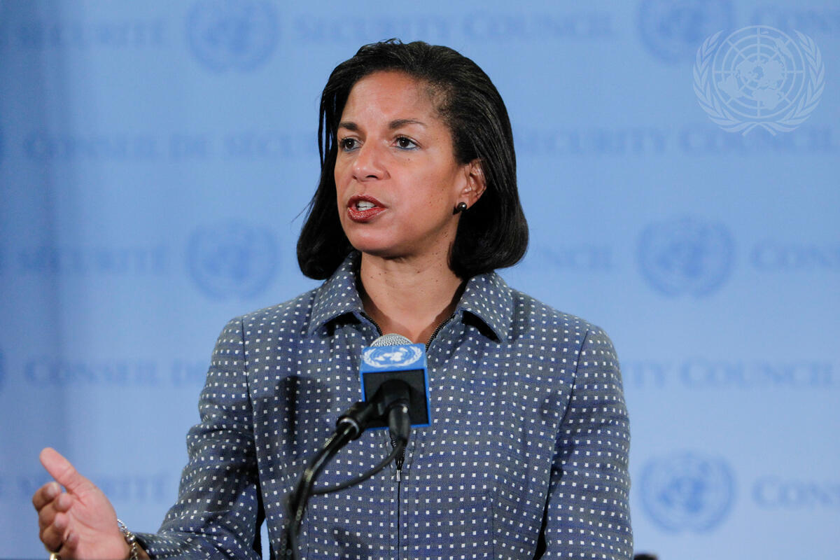 Susan Rcie, Permanent Representative of the United States to the UN, speaks to correspondents following a Security Council closed meeting on the situation in Sudan and South Sudan.