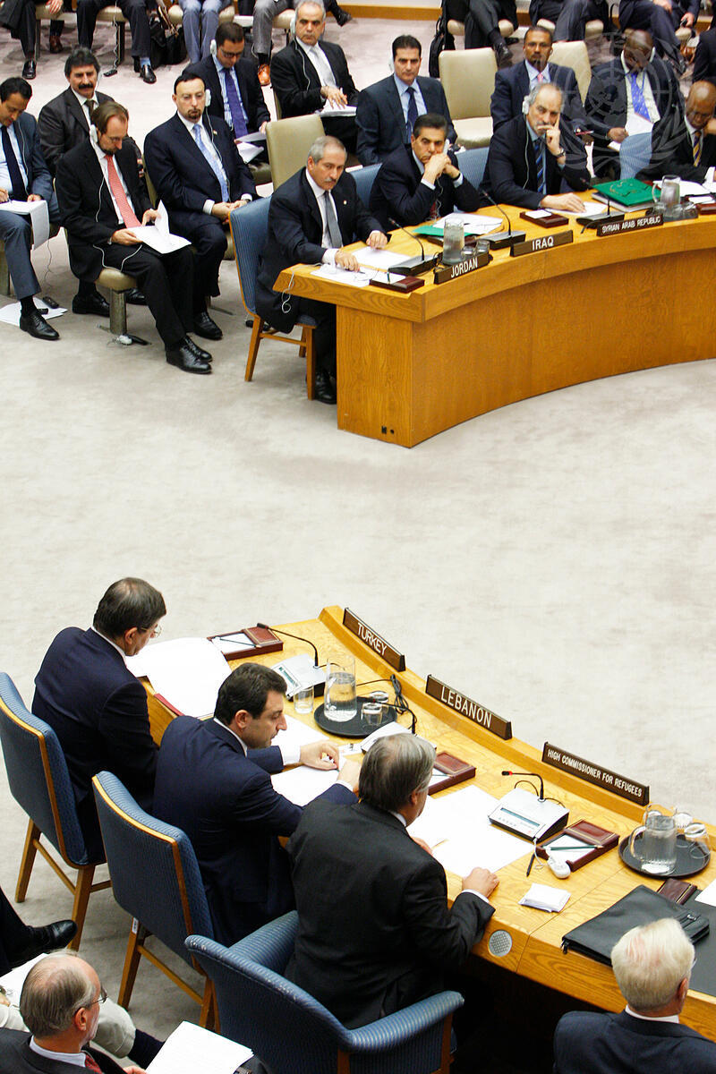 Representatives of Syria and her neighbouring countries listen as António Guterres (third from left, foreground), UN High Commissioner for Refugees, addresses the Security Council's ministerial meeting on the humanitarian situation in Syria. In foreground, from left: Ahmet Davutoglu (right), Minister for Foreign Affairs of Turkey; and Wael Abou Faour, Minister for Social Affairs of Lebanon. At top, front row, from left: Nasser Joudeh, Minister for Foreign Affairs of the Hashemite Kingdom of Jordan; Mohammed Jawad Kadhum Nassir Al-Doreky, Deputy Minister for Foreign Affairs of Iraq; and Bashar Ja’afari, Permanent Representative of Syria to the UN.