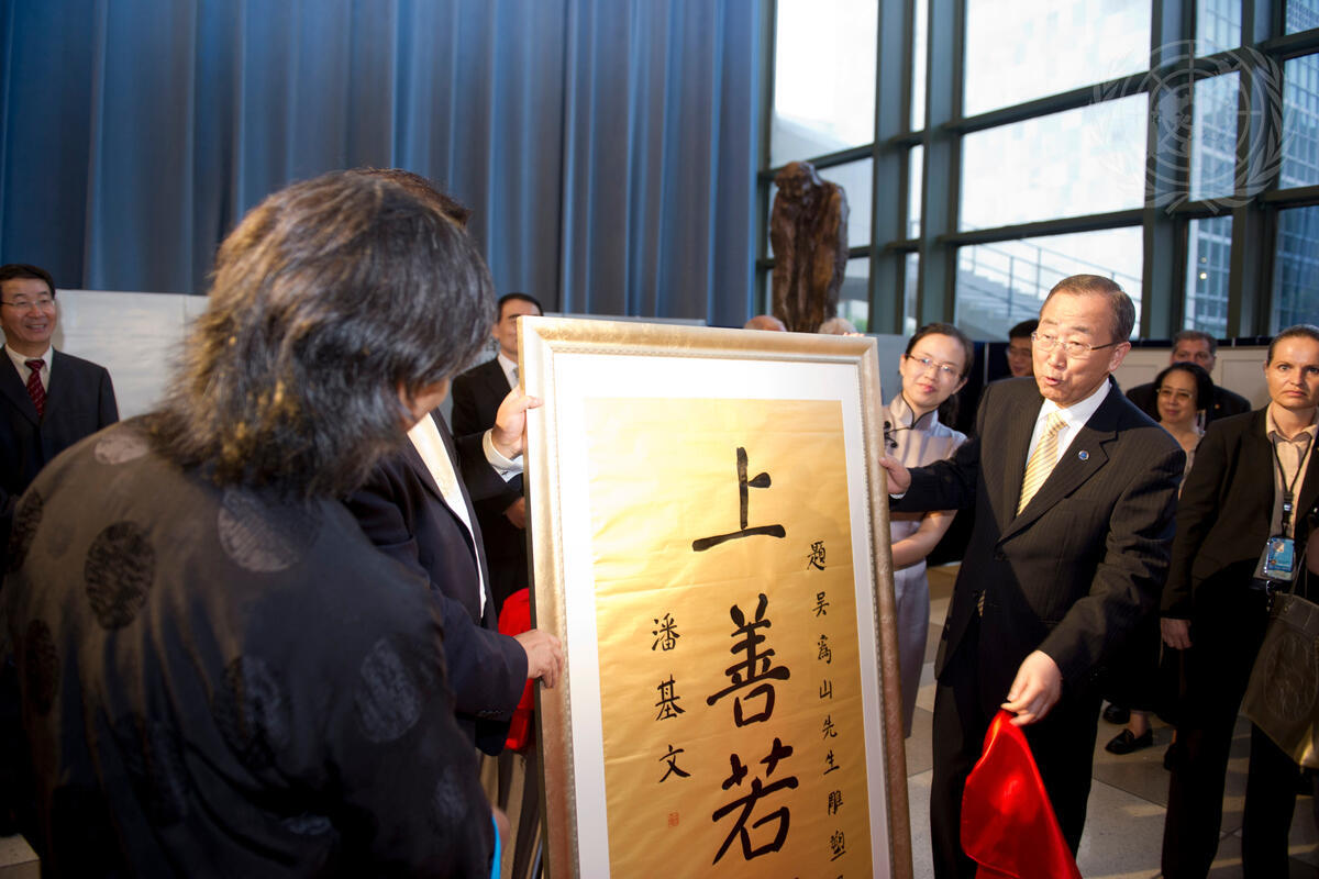 Secretary-General Ban Ki-moon (right) presents a piece of calligraphy to Chinese sculptor Wu Weishan.
