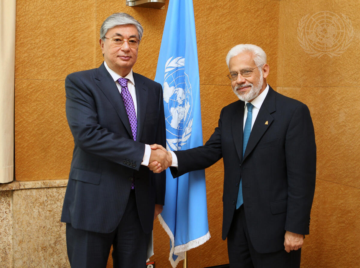 Kassym-Jomart Tokayev (left), Director-General of the UN Office at Geneva (UNOG), meets with Efrain Diaz Arrivillaga, new Permanent Representative of Honduras to UNOG, who presented his credentials.