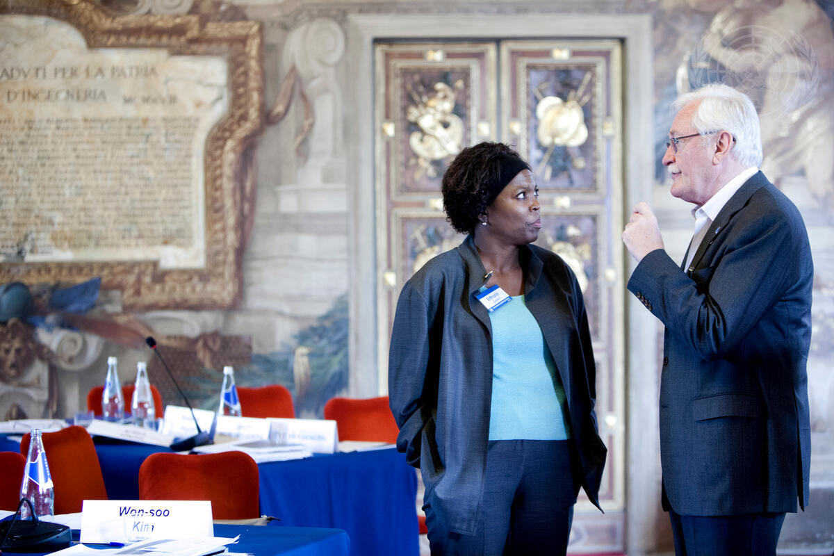 Ertharin Cousin (left), Executive Director of the UN World Food Programme (WFP), speaks to Jean-Jacques Graisse, Acting Head for General Assembly and Conference Management (DGACM), at the retreat for senior officials of the UN system, held in Turin, Italy.