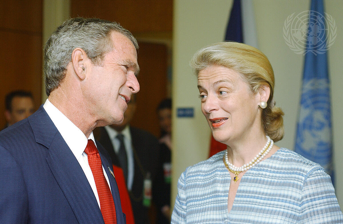 George W. Bush (left), President of the United States, speaks with Nane Annan shortly after arriving to UN Headquarters to address the 57th session of the General Assembly.