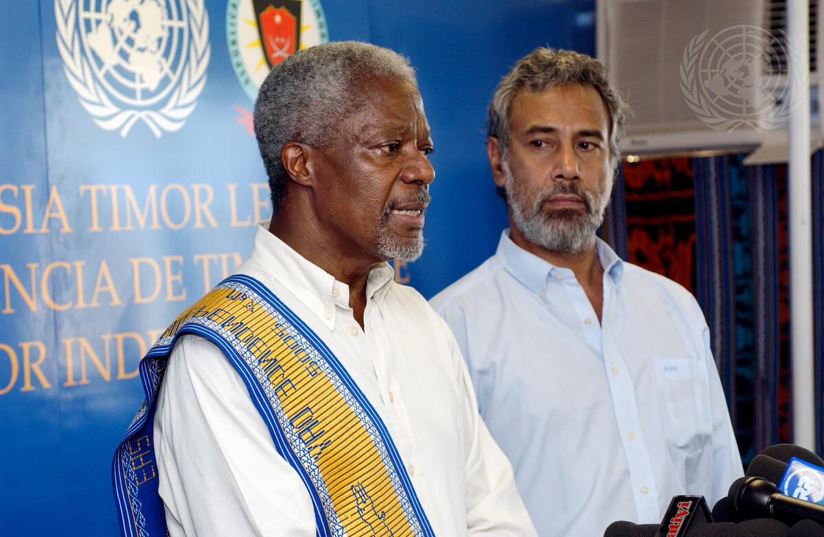 Secretary-General Kofi Annan (right) and East Timor's President Xanana Gusmão at a press conference in Dili.