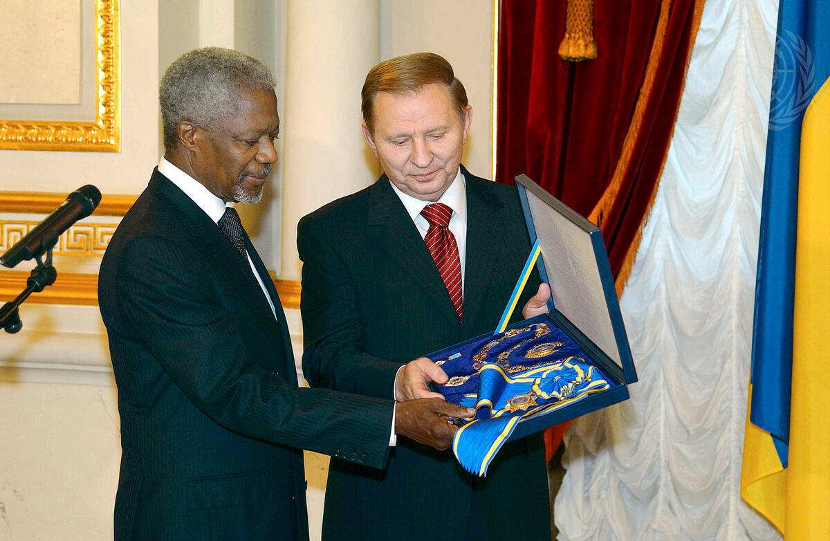 Secretary-General Kofi Annan (left) is awarded the Order of Yaroslav the Wise by President Leonid Kuchma.
