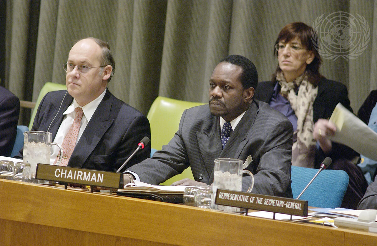 The Committee on the Exercise of the Inalienable Rights of the Palestinian People, in Observance of the International Day of Solidarity with the Palestinian People, holds a solemn meeting. Opening statements are made by the Chairman of the Committee, Papa Louis Fall (right). At left is Jan Kavan, President of the fifty-seventh session of the General Assembly.