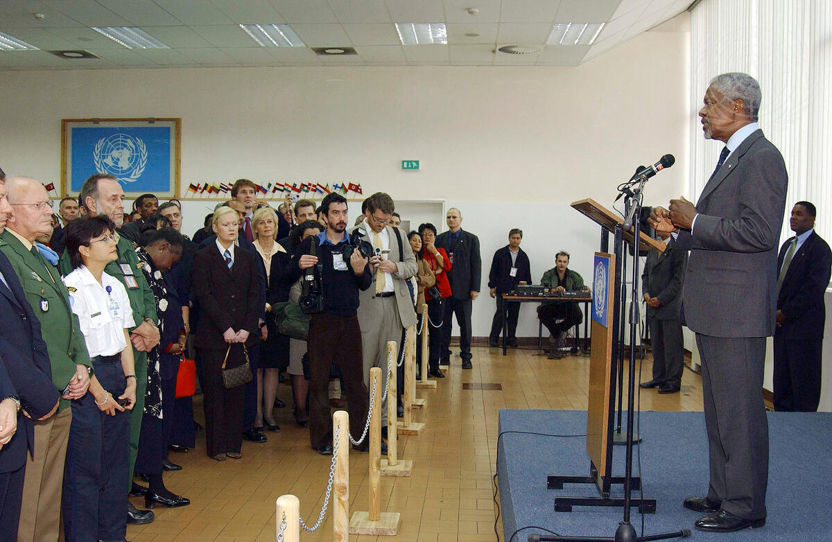 Secretary-General Kofi Annan (right) speaking to UN staff in Sarajevo.