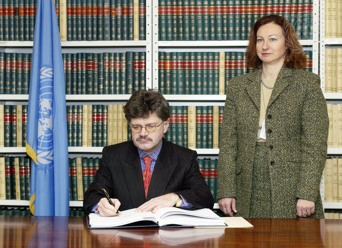 Hurbert Wurth, Permanent Representative of the Mission of Luxembourg to the United Nations, signs the Protocol Against the Illicit Manufacturing of and Trafficking of Firearms, Their Parts and Components and Ammunition, Supplementing the United Nations Convention Against Transnational Organized Crime.