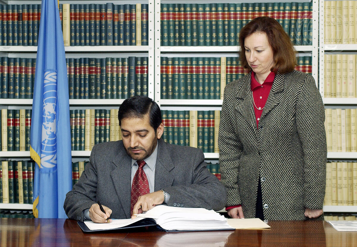 Abdul Aziz Nasser Al Shamsi, Permanent Representative of the United Arab Emirates to the United Nations, signing the Convention against Transnational Organized Crime.