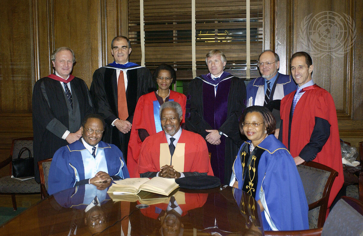 Secretary-General Kofi Annan (seated, centre) received an Honorary Degree of Doctor of Laws from the University of Cape Town, this evening at a Special Ceremony organized by Graça Machel (seated at right), Chancellor of the University of Cape Town, and wife of former South African President Nelson Mandela.