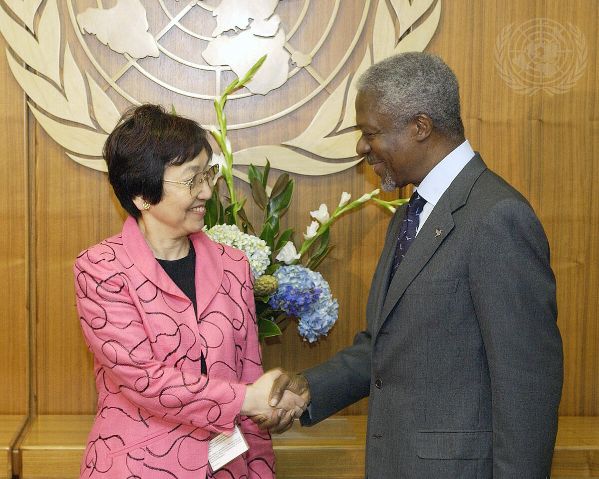 Secretary-General Kofi Annan (right) meets with Yoriko Kawaguchi, Minister for Foreign Affairs of Japan.