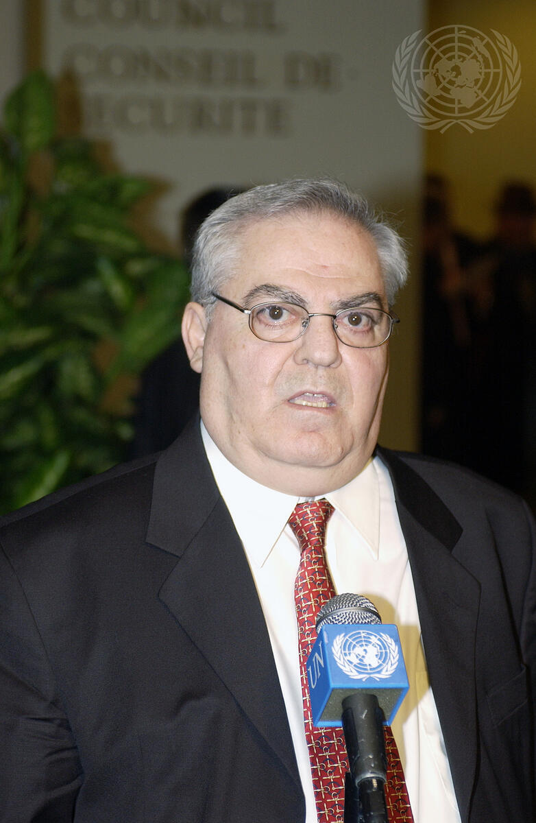 Mikhail WEHBE, Permanent Representative of the Syrian Arab Republic to the United Nations, addresses correspondents at the Security Council stakeout, explaining his delegations vote against resolution 1450 (2002).
