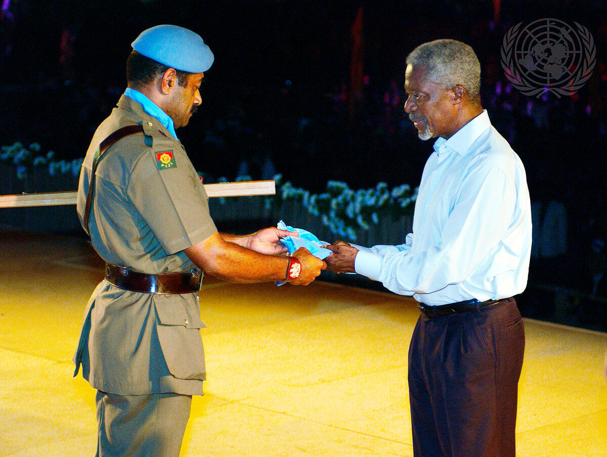 Secretary-General Kofi Annan (right) accepting the United Nations flag, in the handing over ceremony at the start of the Independence Day celebrations of the new nation of East Timor.