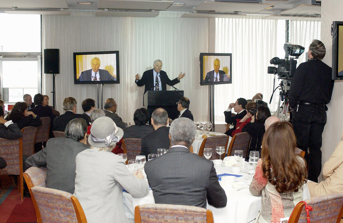 Ted TURNER (centre), Chairman of the Board of Directors of the UN Foundation, speaking at today's luncheon.