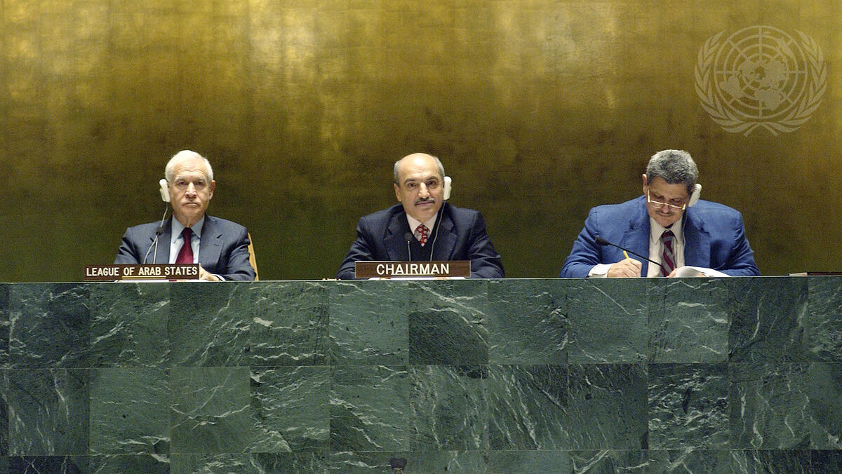 Mohammad Abulhasan (centre), Permanent Representative of the State of Kuwait to the United Nations, serves as the Chairman of the Arab Group at today's meeting.