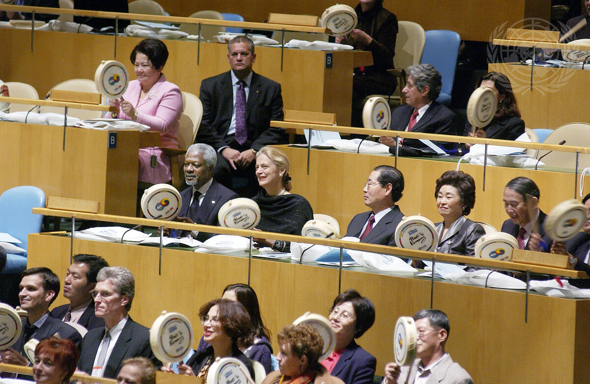 Seated at the concert from left to right are: Secretary-General Kofi Annan; Nane Annan; Joun-yung Sun, Permanent of the Republic of Korea to the United Nations; Yoon-ja Sun; and Kwon-san Park, President and CEO of the Korean Broadcasting System (KBS).
