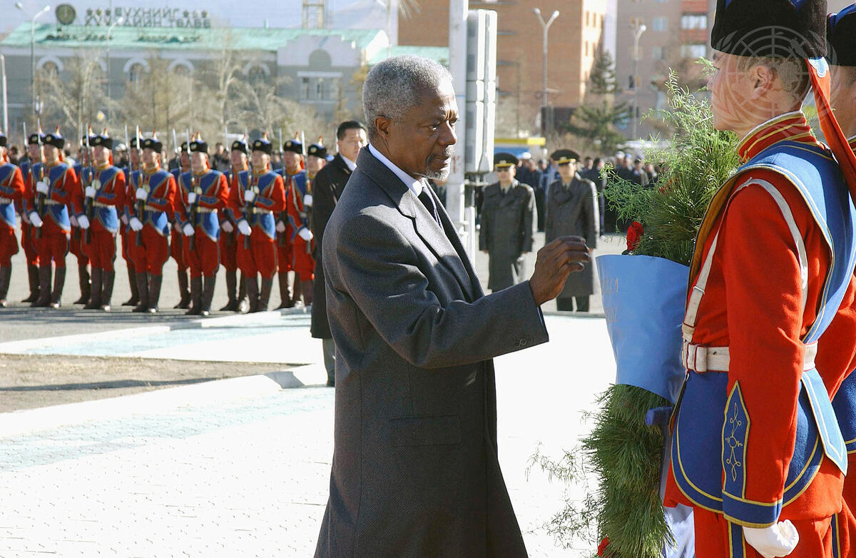 Secretary-General Kofi Annan (centre) participates in a wreath laying ceremony at the Sukhbaatar Monument in Sukhbaatar Square in Ulaanbaatar, Mongolia.