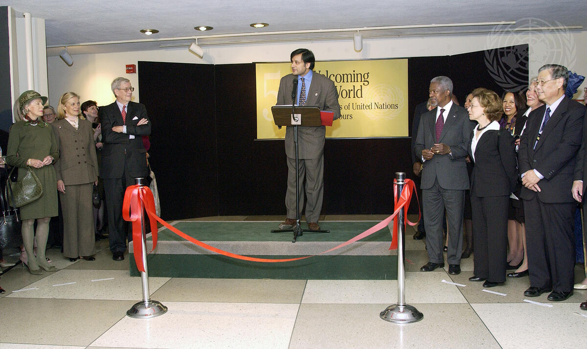 Secretary-General Kofi Annan (on right side of podium) and Shashi Tharoor (at podium), Under-Secretary-General for Communications and Public Information, attends the opening.