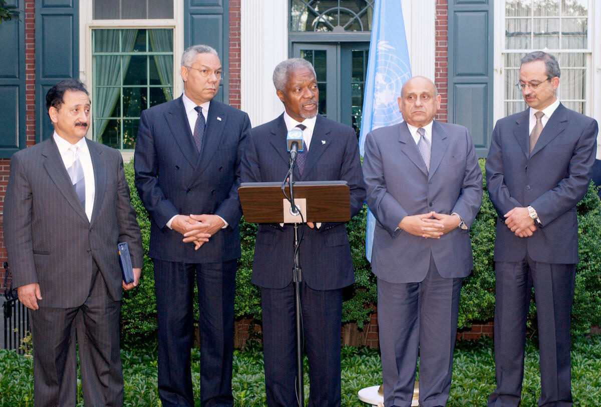 From second left to right: Colin Powell, Secretary of State of the United States; Mr. Annan; Ahmed Maher El-sayed, Foreign Minister of Egypt; Marwan Muasher, Foreign Minister of Jordan.
