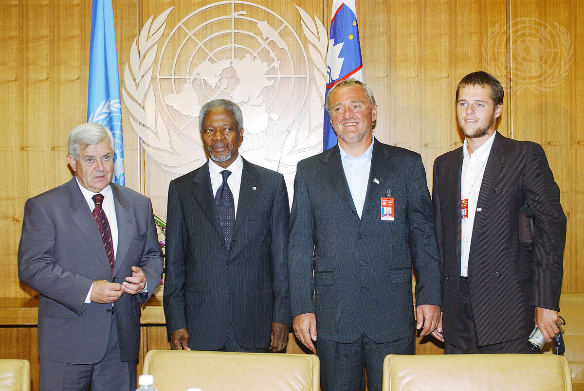 Secretary-General Kofi Annan meeting today with the President of Slovenia, as well as Martin Strel, a Slovenian professional marathon swimmer who recently swam the length of the Mississippi River. From left to right: Milan Kucan, President of Slovenia; Mr. Annan; Martin Strel; and Borut Strel, Martin Strel's son and support crew member.