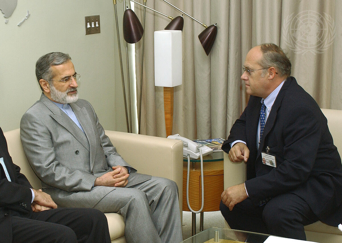 Jan Kavan (right), President of the fifty-seventh session of the General Assembly, meets with Kamal Kharrazi, Minister for Foreign Affairs of the Islamic Republic of Iran.