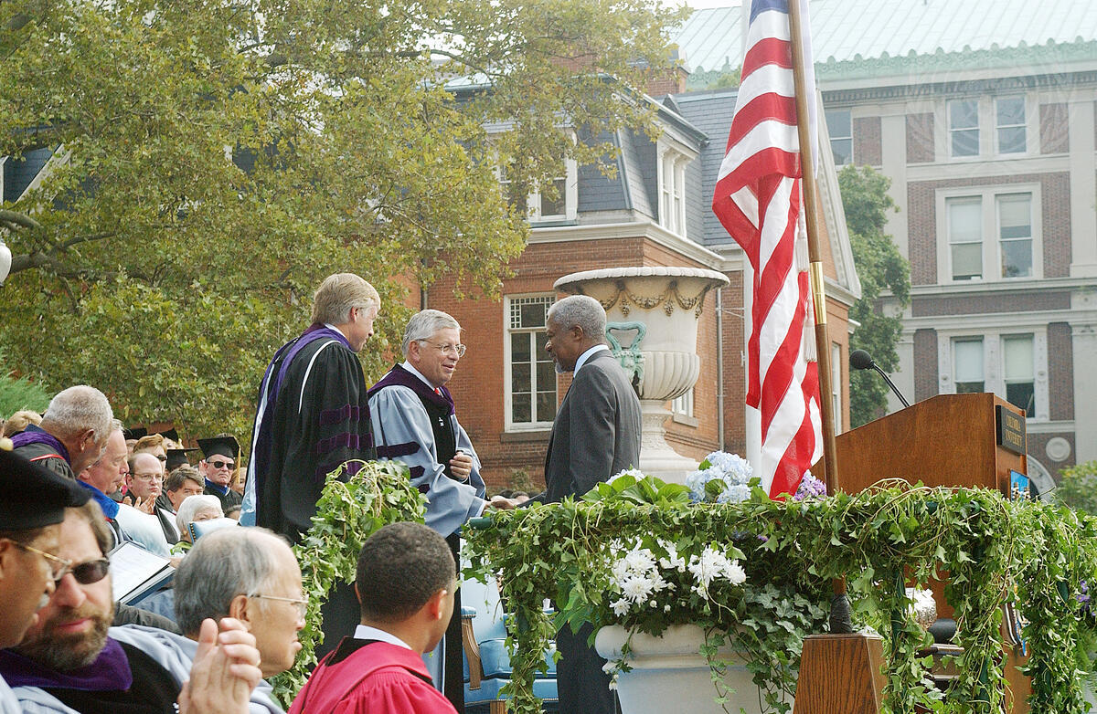 Secretary-General Kofi Annan (right) with the new President of Columbia University Lee C. Bollinger (left) and the outgoing President David Stern (centre).