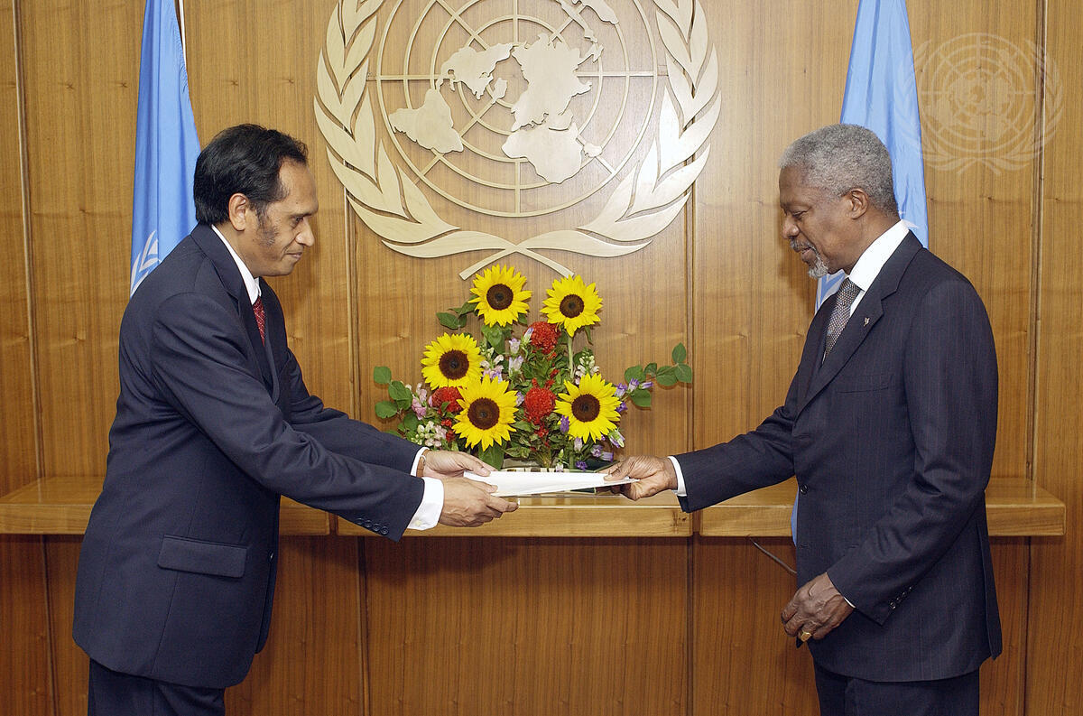 José Luís Guterres (left), the new Permanent Representative of the Democratic Republic of Timor-Leste to the United Nations, presents his credentials to Secretary-General Kofi Annan.