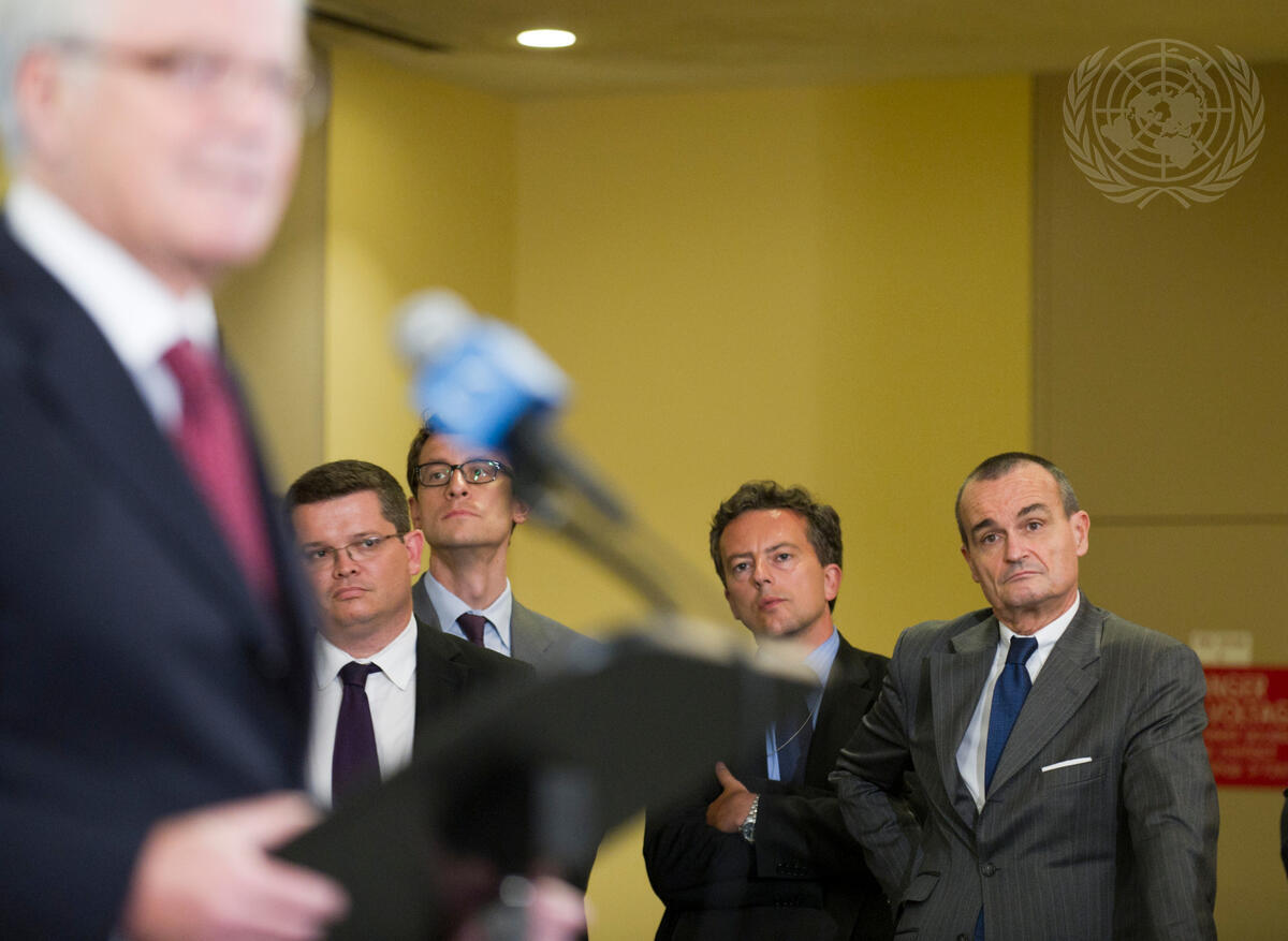 Gérard Araud (background, right), Permanent Representative of France to the U.N. and President of the Security Council for the month of August, looks on as Vitaly I. Churkin (foreground, left), Permanent Representative of the Russian Federation to the UN, speaks to correspondents following Security Council consultations on Syria.