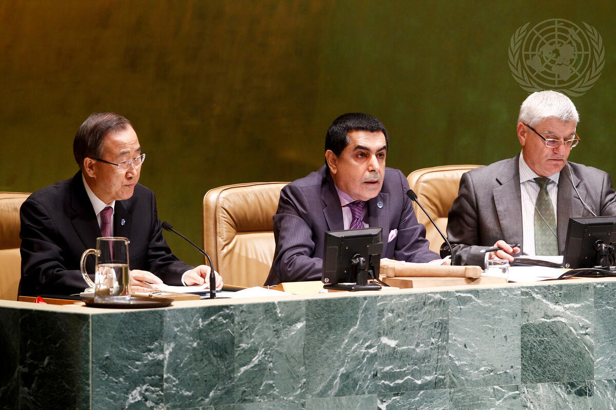 Nassir Abdulaziz Al-Nasser (centre), President of the sixty-sixth session of the General Assembly, addresses the Assembly's meeting on the conflict in Syria. Seated on the left is Secretary-General Ban Ki-moon and to the right is Ion Botnaru, Director of the General Assembly and the Economic and Social Council (ECOSOC) Affairs Division.